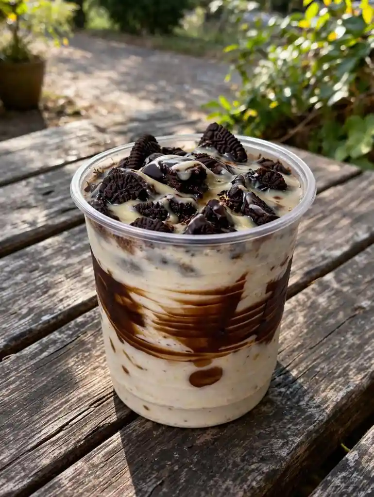 Chicha cremosa, Nutella, canela, leche condensada y oreo en trozos.