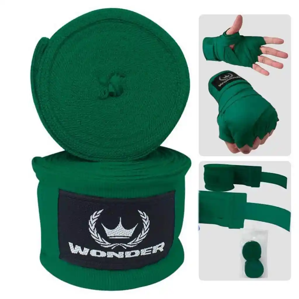 Código: gsp2535 Medidas: 180 Pulgadas (450 cm), ancho de 5 cm. Material: nylon y polyester. Empaque: 2 unidades (una por mano) colores: verde Marca: Wonder sport Vendas de Boxeo 180 Pulgadas Sport Generalmente utilizado para productos como boxeo y MMA. Proporcionan comodidad transpirable y seguridad durante el entrenamiento.