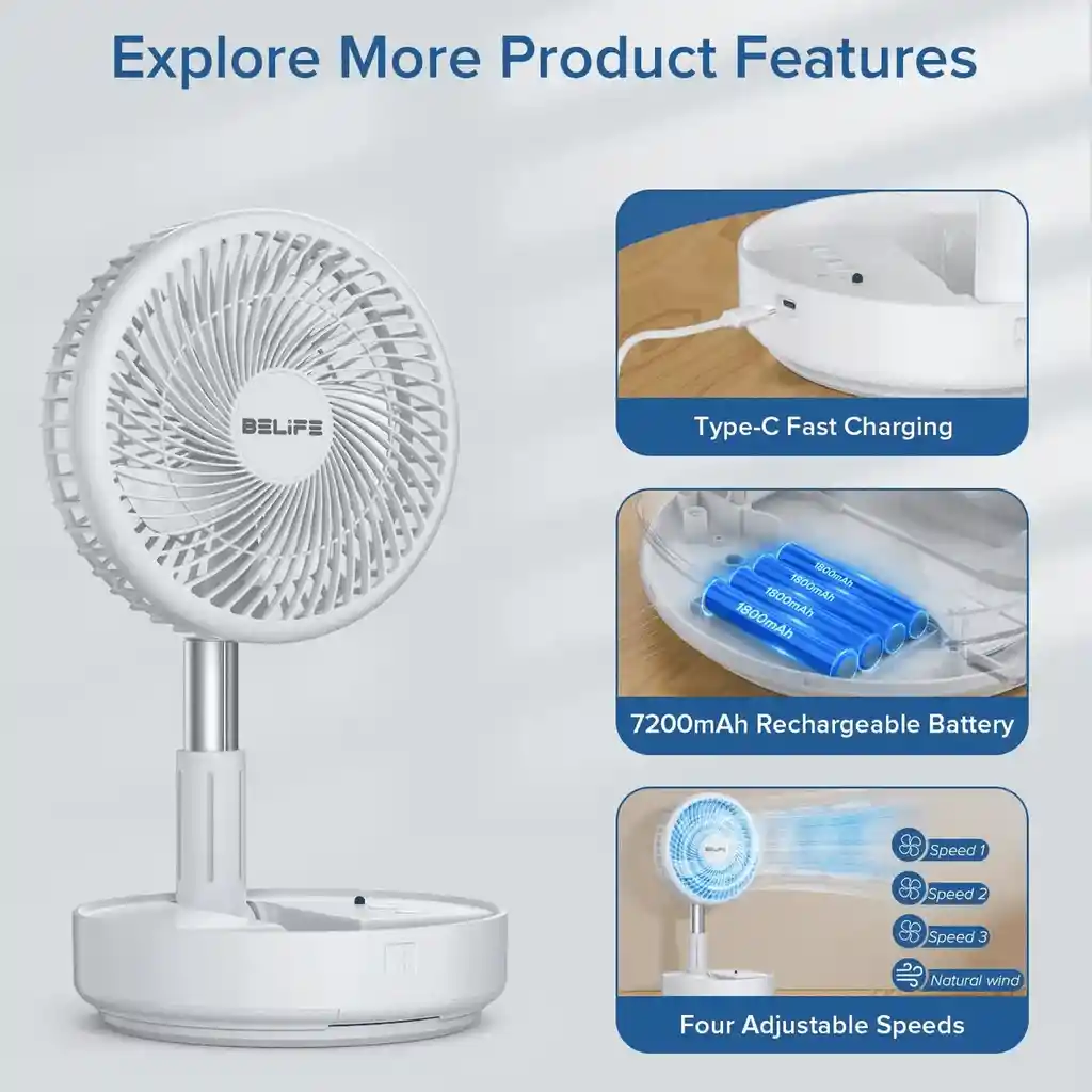 Ventilador telescópico plegable: ajustable en altura de 3.5 a 38 pulgadas, se puede utilizar como un ventilador de mesa personal, un ventilador de pedestal o un ventilador de pie para satisfacer tus diferentes necesidades. Su diseño plegable lo hace fácil de almacenar y llevar en tu equipaje, perfecto para actividades al aire libre como viajes, camping, picnics y pesca. Es esencial para acampar en tiendas de campaña y un gran compañero para el verano. Ventilador oscilante inalámbrico y control remoto: con oscilación de 90° y rotación de 180° para mantenerte fresco desde diferentes direcciones, este ventilador plegable ofrece la comodidad de un control remoto, lo que te permite ajustar y operar sus funciones a distancia. El diseño inalámbrico significa que estás libre de las restricciones de los cables de alimentación y enchufes, lo que te permite colocarlo en cualquier lugar que quieras y disfrutar de la brisa refrescante. 【Batería recargable incorporada】Incorpora una batería recargable de 7200 mAh que puede funcionar de 4 a 16 horas y admite carga rápida USB Type-C de 5V-2A, que se puede cargar completamente en aproximadamente 5 horas.