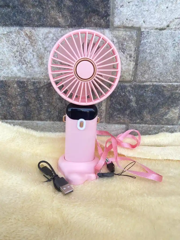 1. Diseño: Cuerpo cilíndrico de plástico con base estable y rejilla en la parte superior para la salida de aire. 2. Motor: Parte negra en el centro del cilindro que alberga el motor eléctrico. 3. Alimentación: Cargador USB (cable negro con conector USB) para recargar la batería interna. 4. Accesorios: Correa rosa ajustable para llevarlo al hombro o sujetarlo. 5. Botón: Interruptor ovalado blanco/rosa en el frente para encender/apagar o ajustar velocidad. 6. Uso: Ventilador manual recargable, ideal para refrescarse en actividades al aire libre o espacios pequeños.