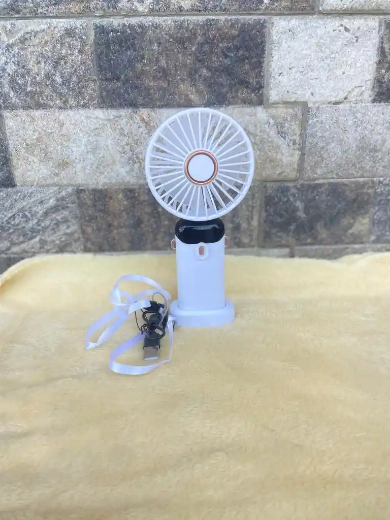 1. Diseño: Cuerpo cilíndrico de plástico con base estable y rejilla en la parte superior para la salida de aire. 2. Motor: Parte negra en el centro del cilindro que alberga el motor eléctrico. 3. Alimentación: Cargador USB (cable negro con conector USB) para recargar la batería interna. 4. Accesorios: Correa rosa ajustable para llevarlo al hombro o sujetarlo. 5. Botón: Interruptor ovalado blanco/rosa en el frente para encender/apagar o ajustar velocidad. 6. Uso: Ventilador manual recargable, ideal para refrescarse en actividades al aire libre o espacios pequeños.