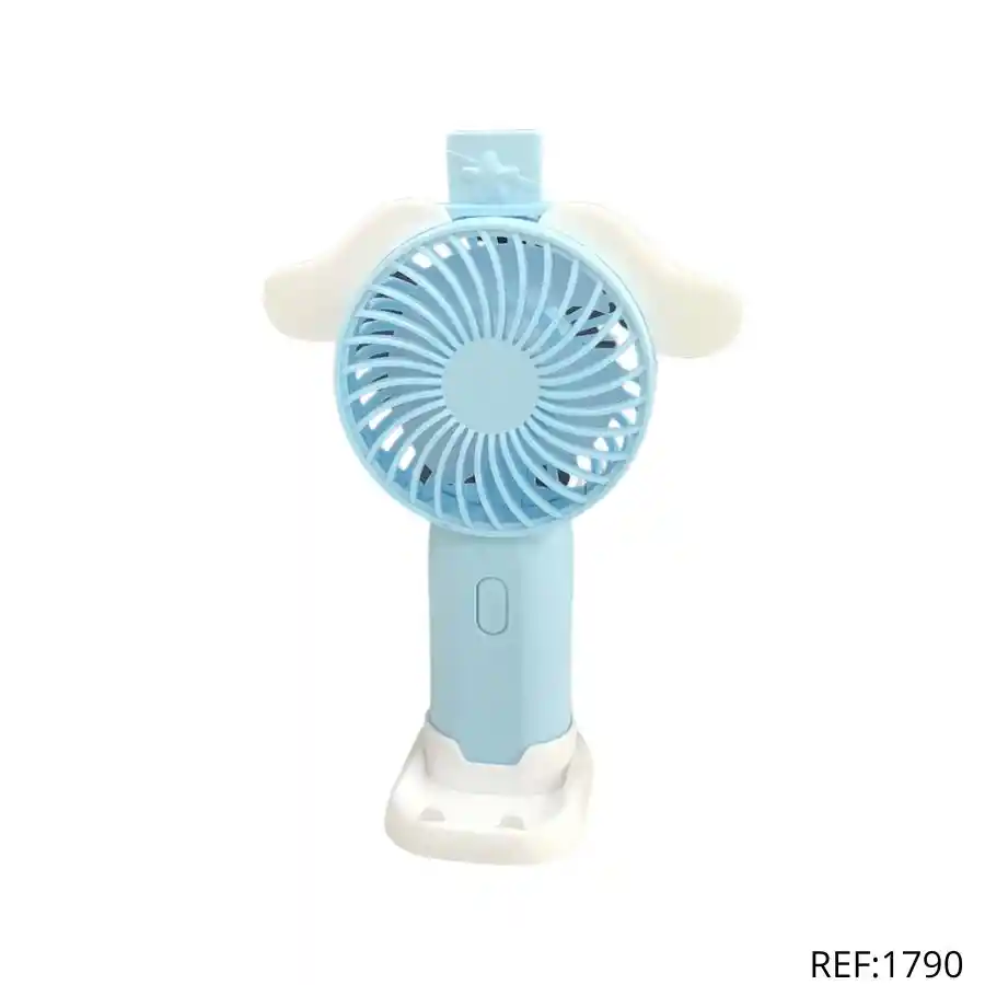 Ventilador portátil con orejitas. Incluye cable USB para cargar. Disponible en azul y rosa. ¡Lindo, práctico y recargable!