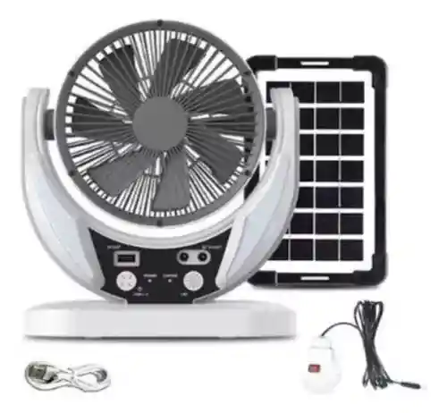 Tamaño: 20x10x24CM Potencia: 10W Voltaje: 6V Vida útil: 20000+ (H) Tiempo de carga: 4-6H Tiempo de trabajo: 4-6H Velocidad de rotación: 900 rpm, 1200 rpm Velocidad del viento: 2 Color: Blanco Material: PP + Hierro + Cobre Función de carga: Sí Tipo de alimentación de entrada: CA o CC Tipo de interruptor: interruptor de pared Fuente de luz: Luz LED (Color: Frío) Producto: Ventilador Portátil Recargable Panel Solar Incluye Ampolleta Cantidad De Aspas: 7 Color De La Estructura: Blanco Color De Las Aspas: Gris Diámetro: 16 Cm Material De Las Aspas: Plástico