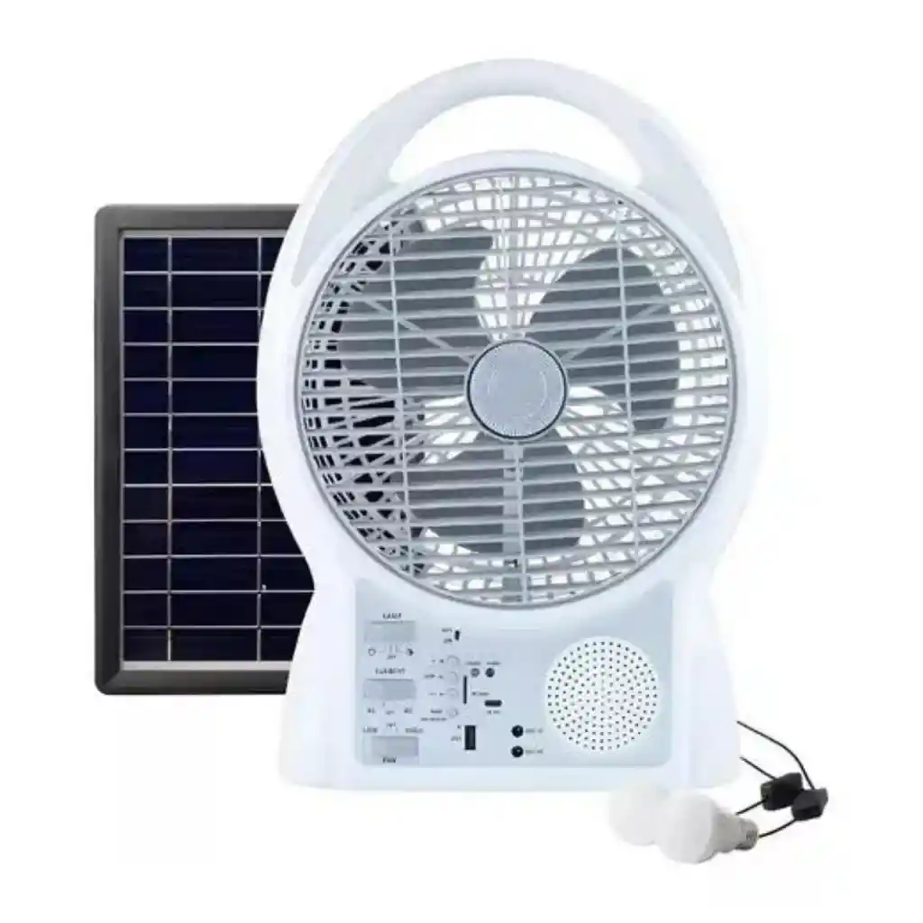 Ventilador Con Panel Solar 6 En 1 Recargable Gd-8029 GD- 8029 Ventilador solar de emergencia con luz LED, Bluetooth, Panel solar, FM, TF Card Descripción: • Tamaño del ventilador de escritorio: 8 pulgadas • Batería recargable lifePO4 3.2v5 .8ah • Función de protección contra sobrecarga y sobredescarga • Radio FM • Bocina Bluetooth • 16 piezas de luz nocturna SMD brillante • Lector de tarjetas USB/TF • Carga móvil USB • 2 velocidades para ventilador • Tipo C para adaptador y carga solar • Voltaje del cargador DC 5v • Función CA/CCay Contenido: • Ventilador de escritorio • Panel solar • 2 unds Bombilla LED