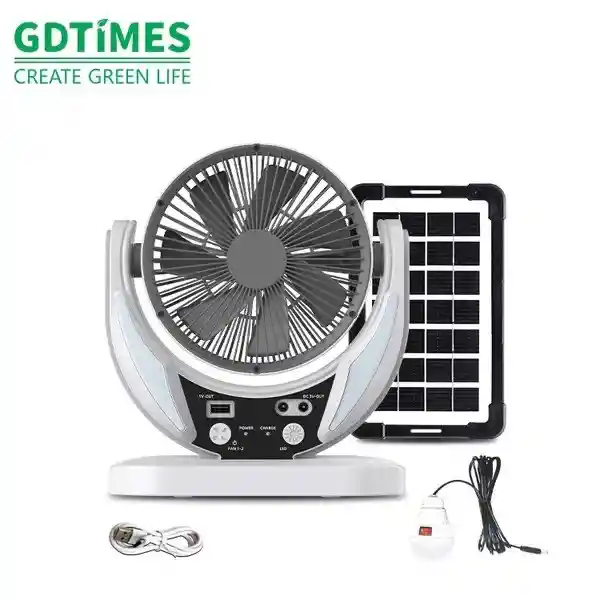 Ventilador recargable con panel solar, incluye un bombillo, cargador y funciona como power bank
