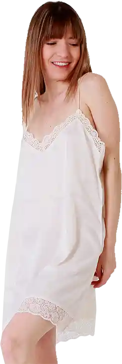 Vestidito corto, en seda color beige. Con sensuales detalles de encaje beige en escote y parte inferior.