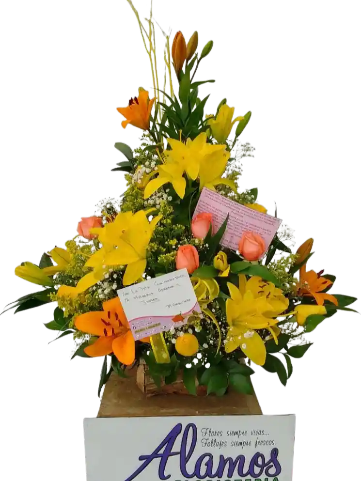 Lirios amarillos y naranjas, rosas salmón, gypsophila y follaje silvestre en una composición llena de luz y alegría natural. Para regalar una tarde de verano eterno a quien más quieres (incluye tarjeta personalizada).
