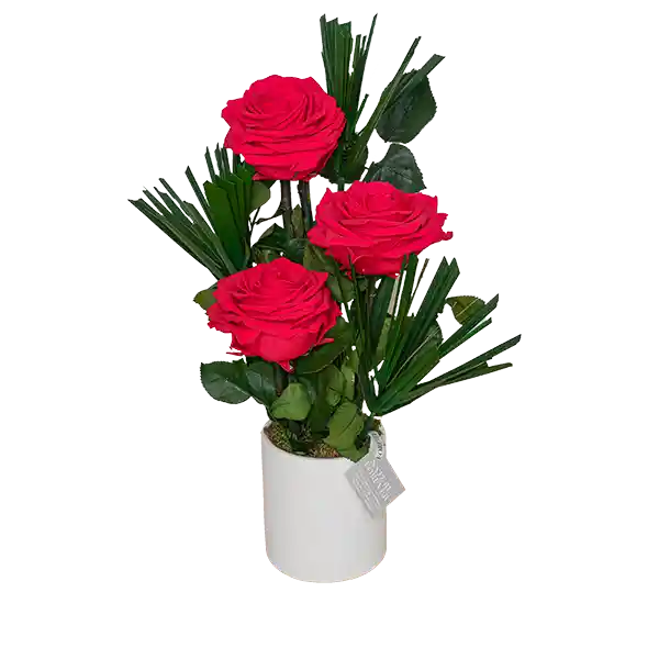 Base cerámica artesanal con tres rosas premium y papyro preservado. Altura: 45 cms. Diámetro: 24 cms.