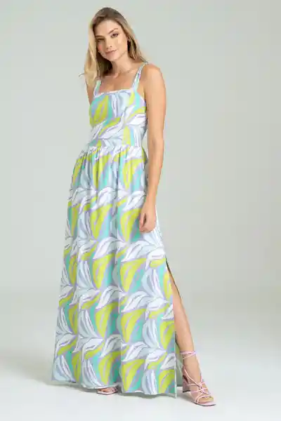 En Chalis Estampado de Tiras Escote Recto Ajusta en Busto y Cintura Falda Larga Con Aberturas Forrado.