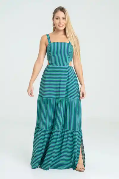 En Chalis Estampado de Tiras Escote Recto Ajusta en Busto y Cintura Aberturas Decorativas en Costados Falda Con Faroles y Aberturas Laterales.