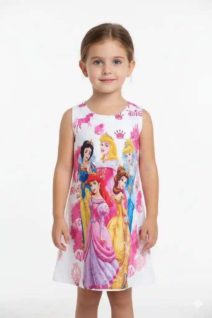 Vestido batola de Princesa Disney para Niñas talla 6-8 Haz que tu pequeñase contagie de la mágia con este hermoso vestido inspirado en las Princesas de Disney. Confeccionado en tela suave y ligera, ofrece comodidad y frescura durante todo el dia. Su diseño colorido y encantador hará que cada niña se sienta como una verdadera princesa. tela algodon ligrado suave talla 6-8 blanca sin mangas estampado de princesa en la parte delantera. parte de atras lisa blanca. Talla: 6 / 8 ¡Dulces sueños con el encanto de Disney y la comodidad que tu pequeña merece!