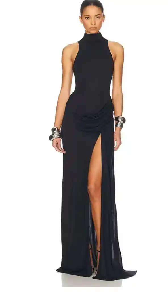 Su silueta ajustada con cuello alto estiliza la figu...Ver más