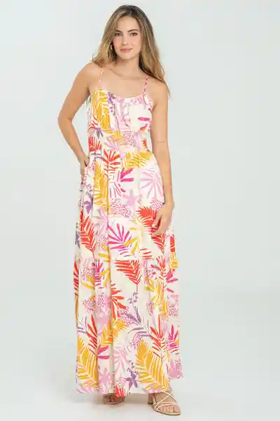 Largo en Tejido Plano Con Dobby de Tiras Escote Redondo Con Recogido y Abertura Decorativa en Frente Cintura Resortada Falda Con Bolsillos y Abertura.
