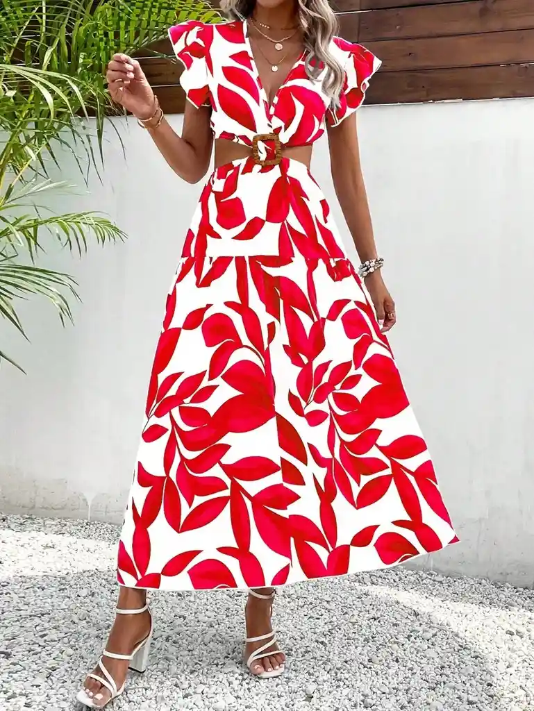 Vestido Con Estampado De Plantas De Manga Mariposa Vinculado Con Aro