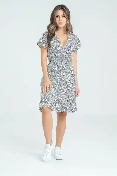 Corto en Tejido Plano Estampado Escote en V Cruzado en la Parte Delantera Manga Corta Con un Poco de Vuelo Fajón Enresortado en Nido de Abeja en Cintura Bolsillos en Los Laterales de la Espalda Bolero en Ruedo Silueta Semi - Ajustada.
