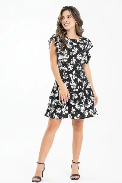 Corto en Tejido Plano Estampado Cuello Redondo Con Sesgo Asentado en la Parte Interna Mangas Con Recogido Fajón de 5 cm en Cintura Abertura Con Ojal y Botón de Pata en la Parte Superior de la Espalda Falda Con Boleros Silueta Semi Ajustada.