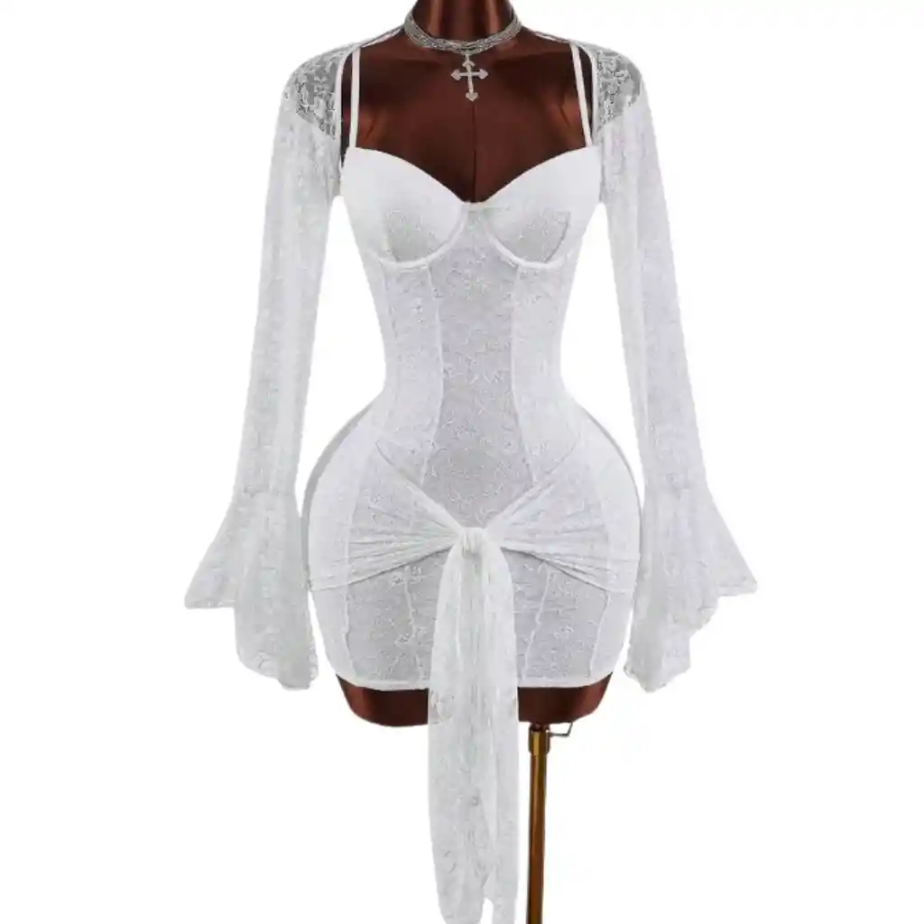 TALLA S Cuenta con copas estructuradas tipo corset que realzan el busto y afinan la cintura. Encima lleva una capa de tela transparente (tipo malla) con encaje, que cubre el pecho y el cuello, dando un efecto sofisticado. 🔹 Mangas: Mangas largas en encaje con terminación acampanada, lo que aporta un toque delicado, femenino y un aire romántico. 🔹 Material: Tela de encaje en todo el vestido, con transparencias sutiles que resaltan la figura sin perder elegancia. 🔹 Parte inferior: Falda tipo mini ajustada con un detalle fruncido en la cadera y una caída de tela lateral (tipo lazo o drapeado) que estiliza y agrega movimiento. 🔹 Estilo general: Es una prenda glamorosa y llamativa, ideal para eventos especiales, fiestas o looks nocturnos donde quieras destacar con un estilo elegante y sexy.