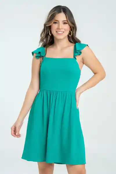 Corto en Tejido Plano Fondo Entero Elástico de 1 cm en Hombro Manga Corta Con Recogido Suave Escote Cuadrado Tanto en Delantero Como en Trasero Cortes en Delantero Trasero y Cintura Bolsillos en Los Laterales de la Faldasilueta Semi Ajustada