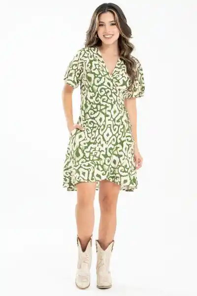 Corto en Tejido Plano Estampado Escote en V Con Sesgo Asentado Manga Corta Corte en Cintura Anuda Con Sesgo de 1 cm Bolero en Ruedo Silueta Wrap Semi Ajustada.