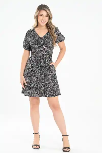 Corto en Tejido Plano Estampado Escote en V Tanto en Delantero Como en Trasero Con Sesgo de 1 cm Tiras de 1 cm Que Sostienen el Escote Trasero Manga Corta Con Elástico de 1 cm en Puño Corte en Cintura Cierre Semi Invisible en Costado.