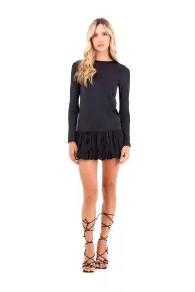Corto Combina Elegancia y Modernidad en Una Silueta Audaz. Su Parte Superior Ajustada de Manga Larga y Cuello Cerrado Contrasta Perfectamente Con la Falda Tipo Globo de Efecto Fruncido Aportando Volumen y Dinamismo al Look.