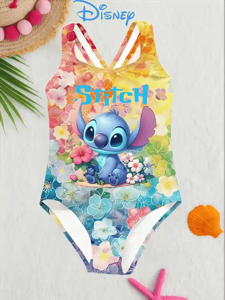 Traje de baño de una pieza para niñas con estampado de dibujos animados de Stitch. Diseño asimétrico hueco, tejido elástico y transpirable, ideal para la playa, la piscina y los deportes acuáticos. Regalo de vacaciones en Hawái, traje de baño de verano con tejido elástico. Detalles del producto. Material: Poliéster Composición: 100% Poliéster Detalles: Asimétrico Estampado: Caricaturas Tela: Elasticidad ligera Instrucciones de cuidado: Lavar a mano, no lavar en seco Estilo: Adorable Tipo: Una pieza Tipo de corte: Regular Método de tejido: Tela tejida Público objetivo: Niña