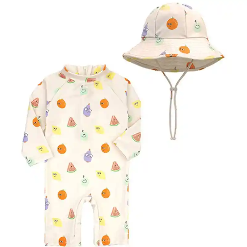 Vestido de baño en enterizo blanco con estampado de frutas, manga larga con cierre y gorro, para niño y niña de 3 Años Material: spandex - poliéster