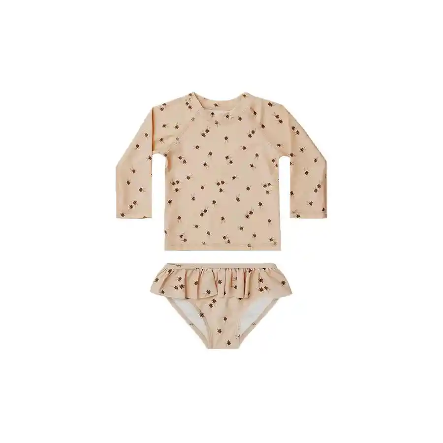 Vestido de baño dos piezas manga larga color rosado en estampado de flores pequeñas y gorro para niña de 4 Años Material: spandex - poliéster