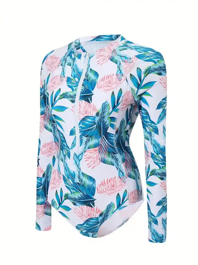 Traje de Baño de Una Pieza para Mujer con Estampado de Hojas Tropicales, Cierre Frontal con Cremallera, Manga Larga, Tejido de Alta Elasticidad - Lavable a Máquina, Pantalones Triangulares. Detalles del producto. Detalles: Cremallera Estampado: Plantas Escarpado: No Tela: Elasticidad alta Estilo de cuello: Cuello redondo Tipo: Una pieza Instrucciones de cuidado: Lavar a máquina, no lavar en seco Estilo: Conservador Material: Poliéster Tipo de impresión: Estampado aleatorio Composición: 82% Poliéster, 18% Elastano Método de tejido: Tela tejida