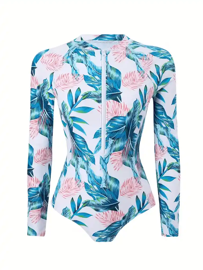Traje de Baño de Una Pieza para Mujer con Estampado de Hojas Tropicales, Cierre Frontal con Cremallera, Manga Larga, Tejido de Alta Elasticidad – Lavable a Máquina, Pantalones Triangulares. Detalles del producto. Detalles: Cremallera Estampado: Plantas Escarpado: No Tela: Elasticidad alta Estilo de cuello: Cuello redondo Tipo: Una pieza Instrucciones de cuidado: Lavar a máquina, no lavar en seco Estilo: Conservador Material: Poliéster Tipo de impresión: Estampado aleatorio Composición: 82% Poliéster, 18% Elastano Método de tejido: Tela tejida