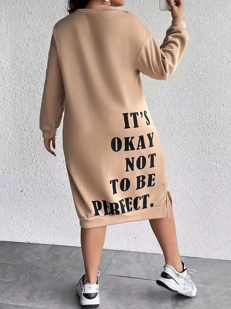 Vestido de Sudadera Casual de Manga Larga con Estampado de Letras, Talla Grande, Corte Recto y Holgado