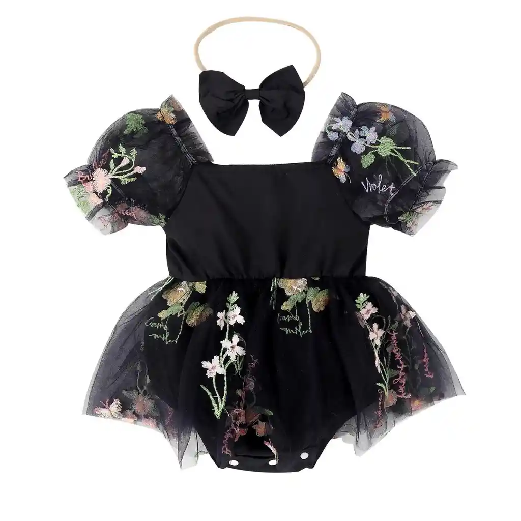 vestido en body con botones en estampado de flores con diadema en color negro para niña de 12-18 Meses