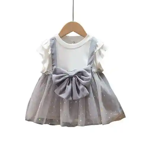 vestido con brillantes gris con blusa pegada de su faltada y moño color gris de tamaño mediano 18-24 Meses