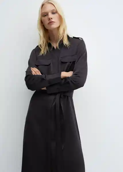 Cierre Delantero Con Botones Cinta en la Cintura Con Cierre de Lazo Cuello Camisero Diseño Midi Diseño Recto Dos Bolsillos de Solapa en el Pecho Efecto Arrugado Estilo Camisero Manga Larga Con Puños Abotonados Tejido Fluido Tejido Satinado Trabillas Trabillas en Los Hombros - 67074036_Bb.