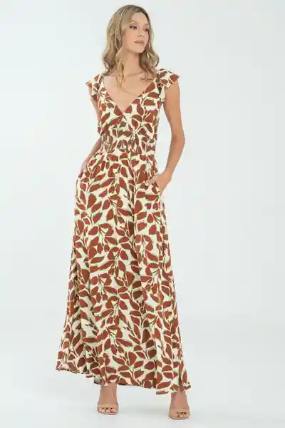 En Chalis Estampado Manga Bolero Escote en V Cintura Resortada Falda Larga Con Aberturas Laterales y Bolsillos.