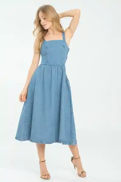 Midi Tirantes en Denim Rígido 100% Algodón Tono Medio Con Manualidad Escote Recto Corte en Cintura Con Recogido Suave Cierre en Costado.