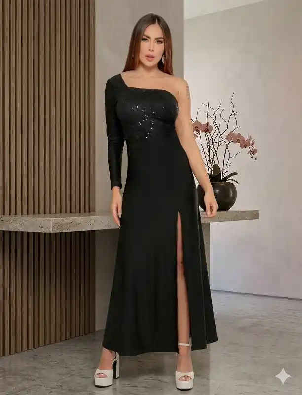 El vestido 2209 es una pieza elegante y sofisticada de longitud maxi, perfecta para eventos formales, galas o noches de fiesta. Su diseño se destaca por un contraste impactante de texturas y un corte asimétrico que realza la figura femenina. Características de Diseño: Corte Asimétrico (One-Shoulder): El vestido presenta un llamativo escote asimétrico de un solo hombro. El lado izquierdo está diseñado con una manga larga y ajustada, mientras que el hombro derecho y el brazo quedan completamente descubiertos, creando un look moderno y sensual. Contraste de Cuerpos: La prenda está dividida visualmente en dos partes: Cuerpo Superior: La parte del torso y la manga están confeccionadas en un material de lentejuelas negras brillantes y densas. Estas lentejuelas captan la luz con cada movimiento, añadiendo glamour y un efecto deslumbrante. Cuerpo Inferior: La falda está hecha de una tela mate de color negro intenso. Esto crea una base sobria y elegante que equilibra el brillo de la parte superior. Falda Maxi con Abertura: La falda es larga hasta el suelo y tiene un corte recto y fluido. Cuenta con una profunda abertura lateral en la pierna derecha que no solo facilita el movimiento, sino que también añade un toque audaz y estiliza la silueta. Detalle en la Espalda: La vista trasera revela una espalda baja y descubierta que complementa el diseño asimétrico del frente, mostrando la piel con elegancia. Ajuste: La prenda está diseñada para ceñirse al cuerpo en el torso, definiendo la cintura, y cae con fluidez en la falda, ofreciendo comodidad y movimiento.