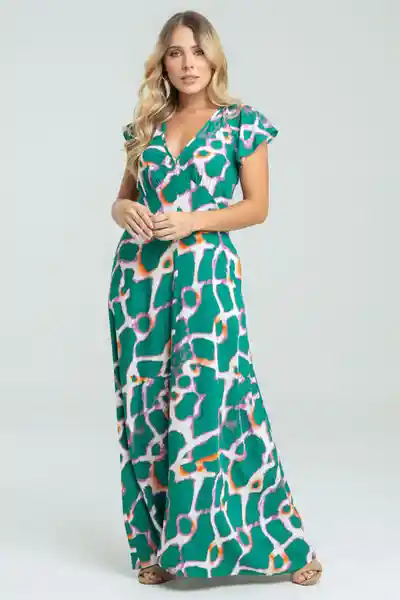 En Chalis Estampado Escote en V Con Sesgo Que Termina en Tiras Que Anudan en Espalda Corte En Centro Frente Que va Hasta Los Costados Cierre Semi Invisible en Costado Manga Corta Con un Poco de Vuelo Bolsillos Laterales.