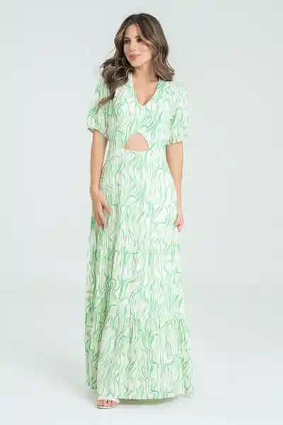 En Tejido Plano Estampado Escote en V Manga Corta Arriba Del Codo Con Recogido Suave en Hombro y Elástico de 1 cm en Ruedo Cierre Semi - Invisible en Costado Detalle de Hueco en la Parte Superior Corte en Cintura Falda de Faroles.