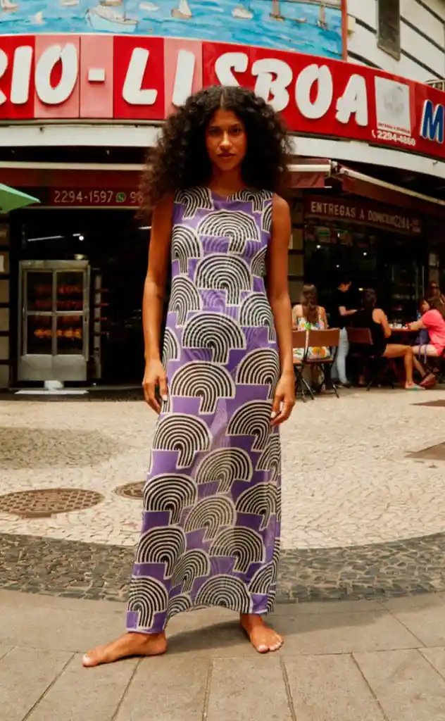 Vestido largo sin mangas en nuestro Copacabana estampado. Silueta recta en tejido ligero y semitransparente. Diseñado para llevar cómodamente sobre el traje de baño.