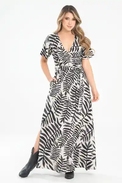 Largo en Tejido Plano Estampado Escote en V Cruzado en la Parte Delantera Con Sesgos de 1 cm Asentado en la Parte Interna Manga Corta Con Ruedo de 0.5 mm Corte en Cintura Pasadores y Cinturón en la Misma Tela Aberuras Laterales en Falda.