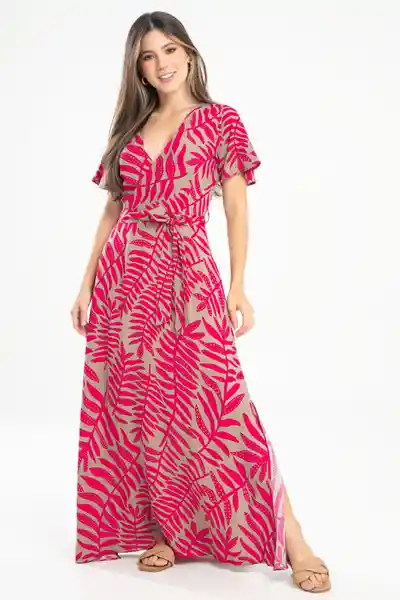 Largo en Tejido Plano Estampado Escote en V Cruzado en la Parte Delantera Con Sesgos de 1 cm Asentado en la Parte Interna Manga Corta Con Ruedo de 0.5 mm Corte en Cintura Pasadores y Cinturón en la Misma Tela Aberuras Laterales en Falda.