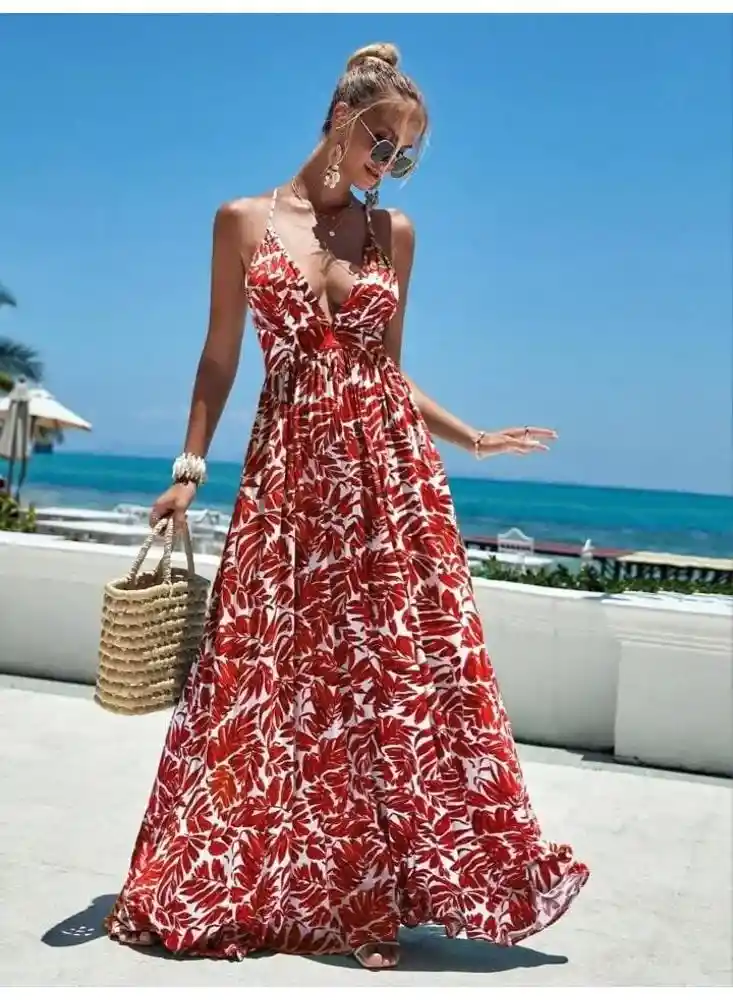Vestido largo de verano casual de vacaciones con cuello en V profundo, estampado de hojas divididas, vestido halter de vacaciones en la playa para mujeres