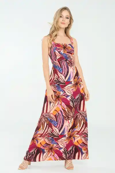 Largo en Chalis Estampado Tiras Gruesas Que Cruzan Atrás Top en la Parte Delantera Que se Convierte Con Nido de Abeja y Van Pegadas al Posterior Aberturas en Los Costados Bolsillos Laterales Cierre Semi Invisible al Costado Izquierdo.