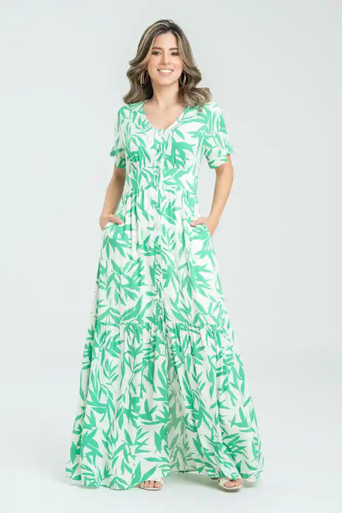 Vestido largo en tejido plano estampado, escote en V con sesgo asentado, guardapolvo con pespuntes en el ruedo de la manga corta, perilla en centro frente con botón forrado, corte bajo en el busto y cintura tanto en delantero como en trasero.