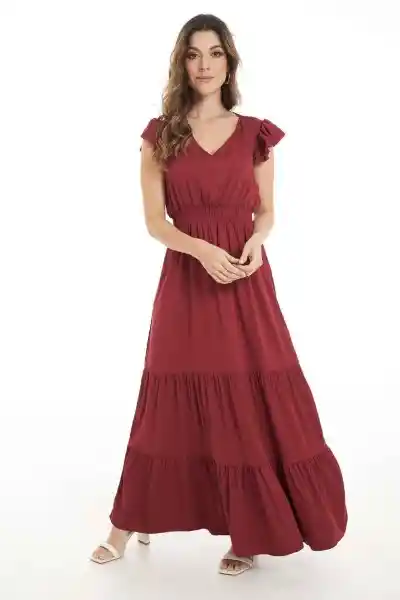 Largo Chalís Fondo Entero Escote en V Con Falso Manga Corta Con un Poco de Vuelo Pretina Resortada en Nido de Abeja Bolsillos Laterales Dividida en 3 Faroles Con Recogido Silueta Semi-Ajustada.