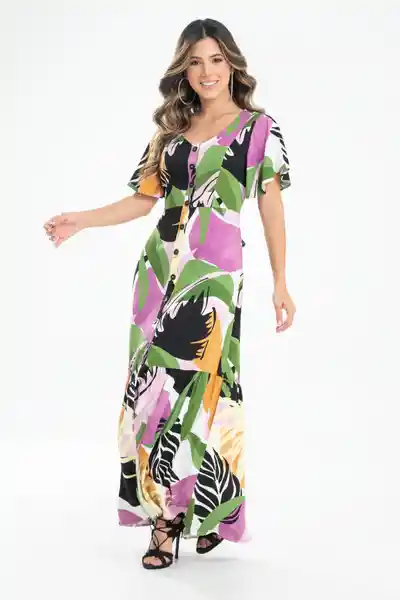 Largo Estampado Escote en V Con Falso Perilla en Centro Frente Con Botones 28L Pinzas en Delantero y en Trasero Corte en Cintura Bolsillos en Los Laterales de la Falda Bolero en Ruedo Con Recogido Suave y Parejo Silueta Semi Ajustada.