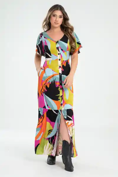 Largo Estampado Escote en V Con Falso Perilla en Centro Frente Con Botones 28L Pinzas en Delantero y en Trasero Corte en Cintura Bolsillos en Los Laterales de la Falda Bolero en Ruedo Con Recogido Suave y Parejo Silueta Semi Ajustada.