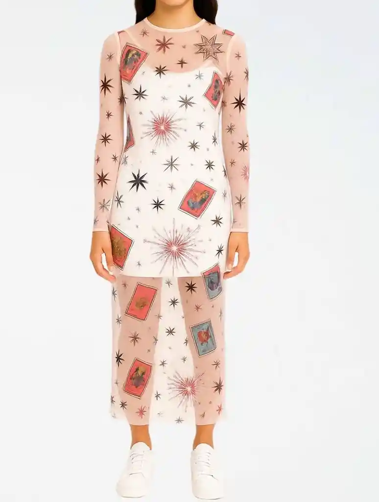 ✨ Vestido tipo mesh con estampados únicos y místicos: una prenda que roba miradas sin esfuerzo. Ideal para crear looks creativos, cómodos y diferentes. 🌠 Tela ligera y con transparencia: juega con capas para transformar tu outfit 🧳 No se arruga: perfecto para llevar de viaje 🪐 Estampados con personalidad: disponibles en 3 diseños cósmicos 🧵 Hecho responsablemente por mujeres colombianas 📏 Cubre desde la talla S hasta la L 📐 La modelo mide 1.70 m y usa talla SM 🧶 Material: 93% poliéster, 7% spandex.