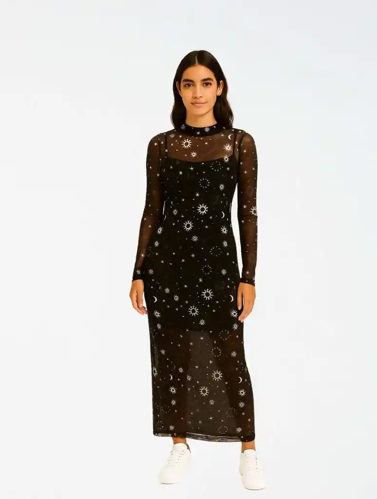 ✨ Vestido tipo mesh con estampados únicos y místicos: una prenda que roba miradas sin esfuerzo. Ideal para crear looks creativos, cómodos y diferentes. 🌠 Tela ligera y con transparencia: juega con capas para transformar tu outfit 🧳 No se arruga: perfecto para llevar de viaje 🪐 Estampados con personalidad: disponibles en 3 diseños cósmicos 🧵 Hecho responsablemente por mujeres colombianas 📏 Cubre desde la talla S hasta la L 📐 La modelo mide 1.70 m y usa talla SM 🧶 Material: 93% poliéster, 7% spandex.